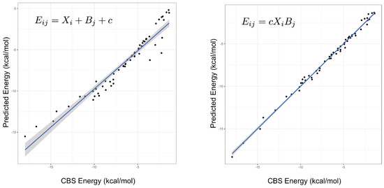 An important indicator of the validity of a fitting procedure is the distribution of the residuals, or equivalently, the correlation between the predicted and actual values. In Figure 1, the predicted vs. actual energies are plotted, demonstrating that the model is a much better fit than Equation (2). Crucially, it appears to abide by the assumptions of the fitting procedure, namely the assumption of normality of errors. This was not the case for the linear model, or any model with an added (rather than multiplied) correction term. The fitted parameters under both models can be found in the Supplementary Materials, with some further discussion of the parameters below. Summary statistics for several different models are given in Table 1, showing that the product models have by far the lowest errors. Both the and models have low root-mean-square errors (RMSEs), their maximum errors are less than 1 kcal mol, and a mean-signed error close to zero indicates there is no systematic under- or over-estimating of the interaction energy. On the other hand, it is clear that a simple weighted dispersion model, i.e., a model where k is optimized as a parameter fixed across all molecules, does not perform well. The statistics presented in Table 1 are for the fitting set of complexes, that is, the same complexes that the parameters were fit to, hence good performance is somewhat expected. The quality of the interaction energies predicted by the product models for complexes not included in the fitting set is examined below.