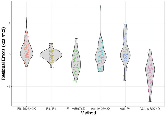 The error distributions for the model over both the fitting and validation sets, along with those calculated using the M06-2X and B97X-D density functionals at the aVTZ level, are shown in Figure 3, with the equivalent plot for the model given in the Supplementary Materials. These functionals were chosen as previous benchmarks have shown them to be particularly good for halogen bonding interactions [75]. From the Figure, however, we see that the simple product model is performing at least as well, if not better than, these functionals. In particular, both the fitting and validation data are centered around zero residual error, indicating no systematic bias, which contrasts with the two functionals, which systematically over- and underestimate the energies slightly, for M06-2X and B97X-D respectively. Moreover, the overall spread is narrow, and mostly concentrated around zero, staying consistently within nominal “chemical accuracy” of 1 kcal mol. This is opposed to M06-2X, which shows a much more protruded density, significantly overpredicting some energies.