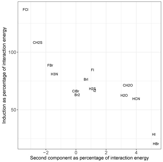 Comparison of induction energy with the energy due to the second component in the principal component analysis, each as a percentage of the total interaction energy, averaged over all systems containing the given molecule in the fitting set. Most systems fall in the middle, but those with larger dispersion (bottom right) or induction (top left) show a marked increase in the importance of the second component to the predicted energy. Please note that the values for ClI overlap those of BrI, so we only show the latter for clarity.