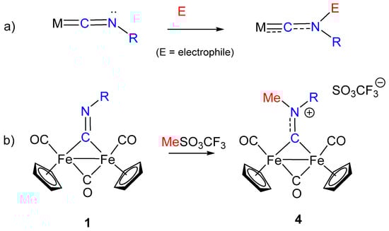 The transformation of isocyanide ligands into carbynes (alkylidynes), upon electrophilic attack at the N atom, is generally observed in mononuclear complexes when the metal is low-valent, and sufficiently electron-rich to activate the CNR ligand towards electrophiles (Scheme 2a) [10]. This requirement usually limits the activation towards electrophiles to low-valent group 6 (Mo or W) or 7 (Re) metal complexes. Conversely, bridging coordination in diiron complexes effectively promotes the reaction of isocyanide ligands toward electrophiles and allows them to extend to iron the transformation of CNR into carbynes. Indeed, treatment with strong alkylating agents (RSO3CF3) of complexes of type 1 (R = Me) transforms isocyanides into the corresponding μ-aminoalkylidyne (aminocarbyne) complexes of the type [Fe2(Cp)2(CO)3(μ-CNRR’)]+, (4) (Scheme 2b) [49,50]. Likewise, di-isocyanide complexes of type 2 are transformed into the corresponding bis-aminoalkylidyne derivatives [Fe2(Cp)2(CO)2(μ-CNRR’)2]2+ [51].