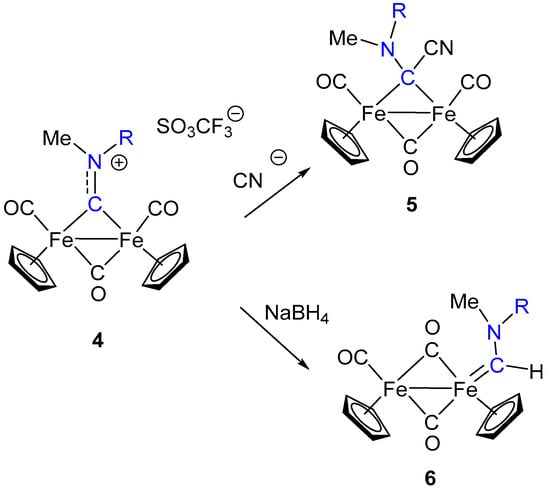 Very recently, the synthesis and isolation of diiron bridging aminoalkylidyne complexes of type 4 have been reinvestigated in order to provide a most convenient access to these complexes [52], which have been proved to be very versatile species and valuable starting materials for obtaining a number of organometallic complexes [52,53]. Although the bridging CNRR’ ligand is usually described as a bridging carbyne (alkylidyne), the >C–N interaction displays some double bond character (C–N bond distances are usually around 130 ppm), and the ligand shows some iminium, or azavinilydene, character. Beside the “formal” description of the >CNRR’ ligand, its reactivity is dominated by the electrophilic character, which is made even stronger by the net positive charge of the diiron complex 4. As a consequence, the bridging amino alkylidyne ligand in 4 can undergo nucleophilic addition at the bridging carbon to form the corresponding aminocarbene complexes 5 and 6 (Scheme 3) [54].