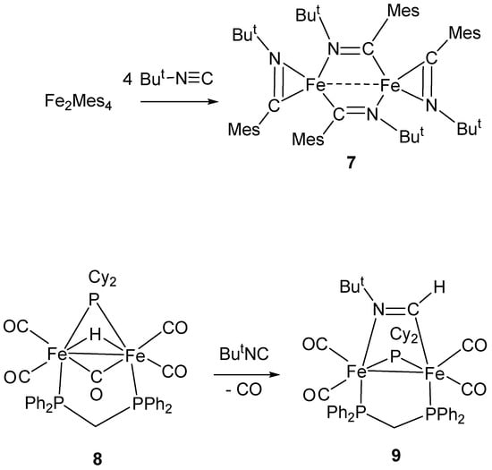 Diiron complexes offer a limited number of examples of isocyanide insertion despite the fact that CNR insertion into the Fe–C of mononuclear complexes is a known possibility, well investigated also in its mechanistic aspects [57,58]. Floriani et al. reported on the reaction of the diiron complex [Fe2Mes4] (Mes = 2,4,6-Me3C6H2) with CNtBu, in THF at 0 °C, leading to the formation of the bridging iminoacyl complex 7 as a result of isocyanide insertion into the Fe–aryl bond (Scheme 4) [59,60].