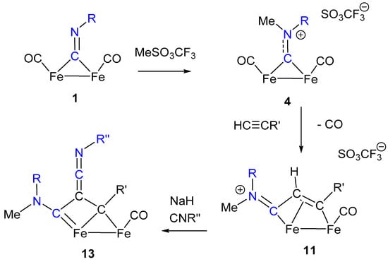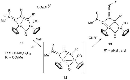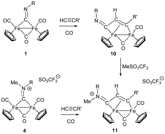 Interestingly, the bridging enimine ligand in 10 can be readily alkylated to form the corresponding cationic bridging vinyliminium complexes in 11 (Scheme 5). These latter can be alternatively obtained by alkyne insertion into Fe-bridging aminocarbyne ligands of complex 4, as shown in Scheme 5 [70,71]. This second synthetic route affords a more convenient and general access to diiron vinyliminium complexes (compounds 11) in that the net positive charge of 4 makes CO elimination viable via treatment with Me3NO, rather than with the less selective photochemical method. The need for CO removal has been explained by density functional theory (DFT) mechanistic investigation on the alkyne insertion reaction [72]. In both synthetic routes leading to 11, the overall remarkable result is the coupling of an alkyne with a bridging isocyanide, accompanied (assisted) by N alkylation. Finally, it is worth noting that the convenient access to 11, by alkyne–isocyanide assembly, has made it possible to fully investigate the huge potential of bridging vinyliminium ligands as versatile and extremely valuable precursors of a large variety of new organometallic species [30,53,73,74,75].