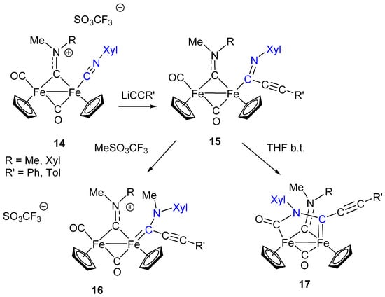 By contrast with the isocyanide transformation to aminocarbene shown in Scheme 3, based on isocyanide methylation followed by nucleophilic addition, the analogous transformation of 14 into the aminocarbene 16 follows the reverse and most classic approach used for this scope, consisting in the nucleophilic addition to CNR, followed by N methylation, as described in Scheme 9. A significant difference is that CNR activation by Fe is not strong enough to allow the addition of nucleophilic species based on heteroatoms (O or N), which are generally used in this type of reaction. Conversely, the observed addition requires a stronger, carbon-based nucleophile: The acetylide. On the other hand, the imidoyl product 15 is stable enough to be isolated and well characterized, which is not so usual [84]. Nonetheless, aminoalkyilidenes (aminocarbenes) are certainly more stable compared to the imidoyl [85]. Therefore, the imidoyl complex 15, upon treatment with MeSO3CF3, readily undergoes methylation with formation of the aminocarbene 16. Interestingly, in the absence of a specific electrophilic reagent able to attack the N atom, the imidoyl ligand in 15 gives rise (upon heating in THF) to an intramolecular rearrangement, consisting in the coupling with the terminally coordinated CO. In other words, even in the absence of a specific alkylation step, the imidoyl can be transformed into aminocarbene by intramolecular addition to CO. A quite remarkable feature is that both the acetylide attack (to form 15) and the reaction at the imidoyl N atom (to form 17) do not involve the bridging aminocarbyne ligand, which simply acts as a spectator one. This is quite surprising, in view of the electrophilic character of bridging aminocarbyne, well remarked in the previous paragraphs. An additional observation is that 17 is the result of a stepwise construction of a rather complex bridging organic frame based on the assembly of different molecular units (CNR, acetylide and CO), with the isocyanide ligand having a pivotal role in the observed transformations.