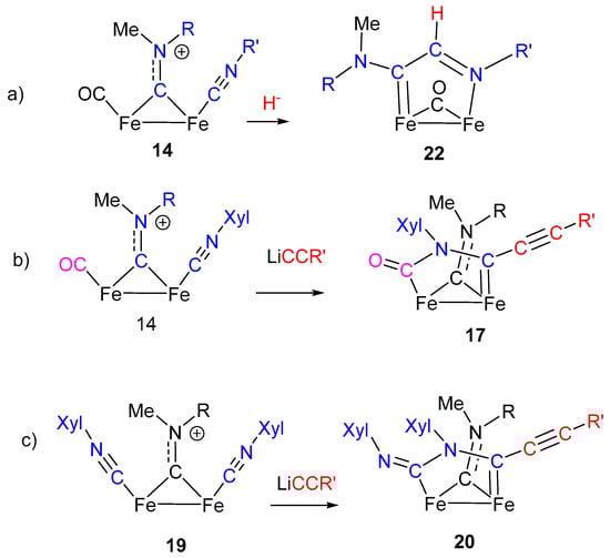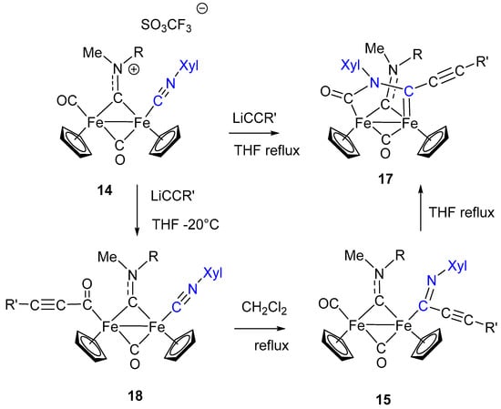 Isocyanide activation toward nucleophilic addition generally requires “electron-poor” metal centers, with reduced electron density (usually, metal ions in the higher oxidation state), to enhance the donor/acceptor properties of the CNR ligand. The nature of the other ligands can also affect the electron density on the metal and consequently the σ/π ratio in the M–CNR bond. Indeed, the most general and successful approach to the transformation of isocyanides into carbenes has been found on palladium and platinum (noble metals in general), but very few examples involving iron have been reported, and these are essentially limited to mononuclear complexes [81,82]. An example of nucleophilic addition at coordinated CNR in diiron complexes is shown in Scheme 10. The reaction of the aminocarbyne complex 14, containing a CNR ligand terminally bound to one Fe, with lithium acetylide leads to the formation of the imidoyl complexes 15 which, in turn, can be methylated at the N atom generating the corresponding aminoalkylidene species 16 [83].