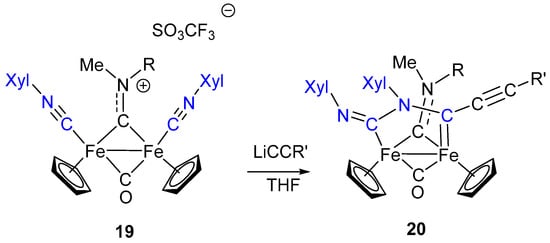 The example provided by the synthesis of 17 is not unique in that a similar reaction is reported for the diiron complex 19, containing two terminally bound isocyanides (Scheme 12) [87]. Likewise the reaction described in Scheme 11, the nucleophilic attack of lithium acetylide to the terminally bound CNXyl ligand generates an imidoyl intermediate which, in turn, reacts with another ligand. In this case, the intramolecular rearrangement involves the other CNR ligand, leading to the formation of the complex 20. The overall result is the coupling of two isocyanide ligands, initiated by a nucleophilic addition, with formation of a C–N bond. The resulting frame, displaying a C–N–C–N atom chain sequence, remains anchored to the iron atoms through bridging coordination in the form of aminocarbene-N aminoacyl ligand. Compared to the reaction sequence described in Scheme 11, the formation of 20 occurs in one single step, and intermediate species have been not isolated in this case.