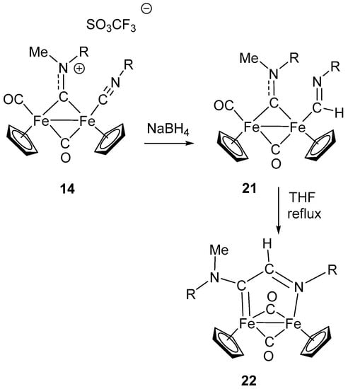 A further example of nucleophilic addition at coordinated CNR ligand giving rise to a sequence of intramolecular rearrangements is shown in Scheme 13. Hydride addition to the isocyanide complex 14 generates the formimidoyl intermediate 21, which further rearranges, after prolonged heating in THF, to form the aminocarbene-aldimine complex 22 [97]. The reaction, providing an uncommon example of Fe-formimidoyl formation by hydride addition at a CNR ligand [98], further demonstrates the effectiveness of diiron complexes in stabilizing unusual intermediate species (e.g., the formimidoyl function). Upon thermal treatment, the formimidoyl 21 rearranges, involving the bridging aminocarbyne ligand, with formation of complex 22, containing a bridging aminocarbene-aldimine ligand, coordinated to the two Fe atoms through the imine nitrogen and the carbene carbon.