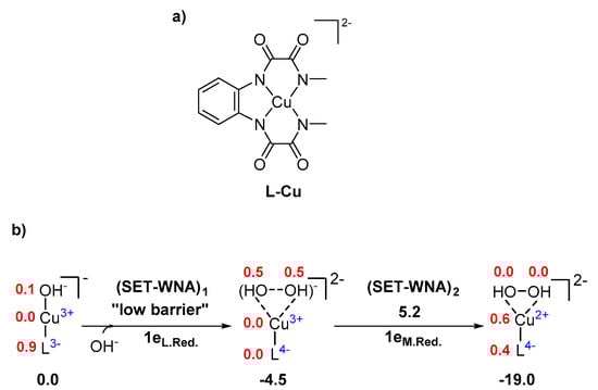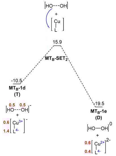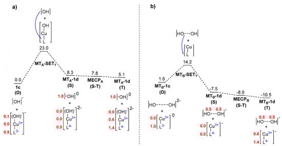 Marcus theory is then applied to the following to estimate the outer-sphere barrier for the first electron transfer in our CuL system. Two models were considered. In the first model (Figure 3a), we considered that the electron transfer departs from the OH− moiety (donor) and goes to the 1c complex (acceptor). The associated free energy barrier for the outer-sphere electron transfer following this model, MTA-SET1, is 23.0 kcal/mol from intermediate 1c (Figure 3a). The product generated with this model would consist of a radical ·OH moiety and the one-electron reduced form of the complex, MTA-1d, in the singlet spin state. The energy of the resulting state of this first electron transfer is 8.3 kcal/mol. Then, the system could evolve through MECPA(S-T) to result in the triplet spin state form of the catalyst, which is found at 3.2 kcal/mol below the singlet state.