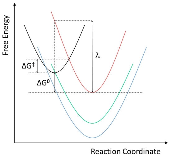 An interesting aspect of Marcus theory is the relation between the kinetic barrier of electron transfer and the reaction themodynamics. The most common case, which we will consider in this work, is that shown in red in Figure 2. The more exergonic the reaction, the lower the barrier for electron transfer. In the case where the intersection point between the curves for reactants and products is at the equilibrium coordinate of the reactant surface, no thermal activation is necessary, i.e., the reaction is barrierless (green line in Figure 2). When the intersection between both curves is at some point previous to the equilibrium coordinate of the reactants, the activation energy increases with the exothermicity of the process (blue line in Figure 2). The latter case has been labeled as “Marcus inversion region”.