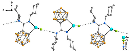 In the germanium(II) derivative 3, the stereo-active lone pair leads to a trigonal-pyramidal coordination environment of the Ge center (Figure 1). At 204.0(5) and 229.4(2) pm, respectively, the Ge–C and Ge–Cl bond lengths are expectedly longer than in the previously reported germanium(IV) derivative GeCl3[HLiPr] (Ge–C 195.6(2) pm, Ge–Cl 226.4(1) pm) [22]. However, the Ge–N distances are very similar in both compounds (3: 205.3(5) pm, GeCl3[HLiPr]: 204.8(2) pm). Rather untypical for carboranylamidinates, the molecules in 3 are assembled through weak N–H⋯Cl hydrogen bonds to infinite supramolecular chains (Figure 2). In the previously reported complexes with [HL]–-type ligands, no hydrogen bonding with participation of the amidine NH moiety has been observed [21,22].