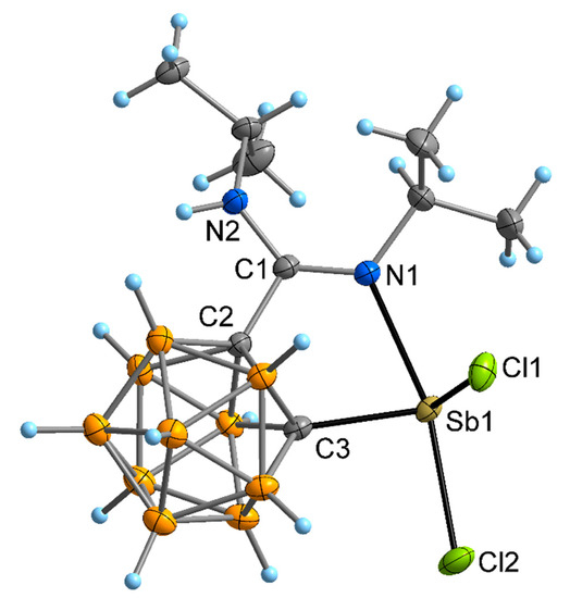 Both title compounds 3 and 4 were fully characterized through the usual set of elemental analyses and spectroscopic methods. The 1H- and 13C-NMR data of 3 were in good agreement with the expected composition. In the 1H-NMR spectrum, a singlet at δ 8.06 ppm could be assigned to the uncoordinated NH functionality of the amidine unit. High molecular mass peaks in the mass spectrum of 3 were detected at m/z 457 (87% rel. int.) [M − H]+ and 422 (13% rel. int.) [M − Cl]+. The absence of peaks at higher molecular masses confirmed the monomeric nature of 3. In the IR spectrum of 3, typical bands of the amidine moiety were observed at 3403 cm−1 (νN–H), 1577 cm−1 (νC=N), and 1260 cm−1 (νC–N). A medium strong band at 2584 cm−1 can be assigned to the carborane cage (νB–H) [22]. The antimony derivative 4 was fully characterized in the same manner. The 1H-NMR spectrum of 4 displayed a characteristic signal pattern of the two chemically inequivalent isopropyl groups (two doublets and two septets). In this case, the NH resonance could not be observed. However, the presence of a [HLiPr]− ligand in 4 was confirmed by a sharp νN–H band at 3396 cm−1 in the IR spectrum. Additional characteristic bands of the amidine group were observed at 1605 cm−1 (νC=N) and 1251 cm−1 (νC–N), and the carborane backbone gave rise to a series of strong bands around 2590 cm−1 (νB–H) [22]. In the mass spectrum of 4, the highest molecular mass peak at m/z 426 (60% rel. int.) could be assigned to the ion [M − Cl]+.
