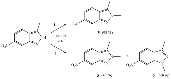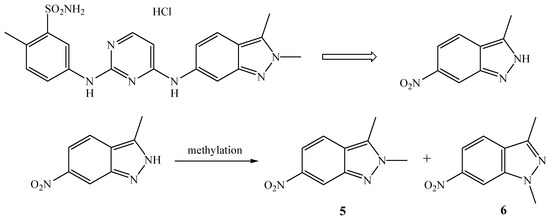 This prompted us to study reactions of 1 and 2 with 3-methyl-6-nitro-1H-indazole. This compound is a starting material for the manufacture of pazopanib hydrochloride (Figure 1). Pazopanib hydrochloride is tyrosine kinase inhibitor and is used clinically as angiogenesis modulating and antineoplastic agent [36]. The first stage of its manufacture includes N-methylation of 3-methyl-6-nitro-1H-indazole. This process is critical stage since desirable 2,3-dimethyl-6-nitro-2H-indazole (5) is always contaminated with isomeric 1,3-dimethyl-6-nitro-1H-indazole (6). Several papers have reported optional reagents and conditions for preparation of 5 [37,38,39], however, laborious recrystallizations have been still required to purify 5 from isomeric 6.