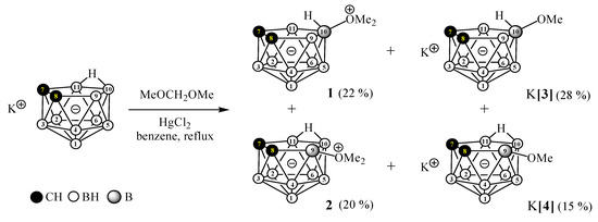 We found that the reaction of potassium 7,8-dicarba-nido-undecaborate K[7,8-C2B9H12] with mercury(II) chloride in a mixture of dimethoxymethane and benzene results in the formation of mixture of symmetrically and asymmetrically substituted dimethyloxonium derivatives 1 and 2, as well as the corresponding methoxy derivatives K[3] and K[4] (Scheme 1), that was separated by column chromatography on silica.