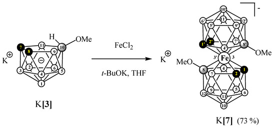 Transition metal complexes with carborane ligands, or metallacarboranes, found application in a wide variety of fields including nuclear fuel reprocessing [40,41], catalysis [42], new material design [43,44,45,46], medicine [4,5,47,48,49,50,51,52], etc. Therefore the obtained methoxy derivatives of nido-carborane K[3] and K[4] were used for synthesis the corresponding iron and cobalt bis(dicarbollide) complexes. Earlier we described the synthesis of symmetric 8,8′-dimethoxy derivative of cobalt bis(dicarbollide) [8,8′-(MeO)2-3,3′-Co(1,2-C2B9H10)2]− by alkylation of the corresponding dihydroxy derivative [53]. In this contribution we report synthesis of analogous paramagnetic 8,8′-dimethoxy derivative of iron bis(dicarbollide) K[8,8′-(MeO)2-3,3′-Fe(1,2-C2B9H10)2] (K[7]) by the reaction of K[3] with anhydrous FeCl2 in tetrahydrofuran in the presence of potassium tert-butoxide (Scheme 4). The 11B NMR spectrum of [7]− contains signals at 114.6, 6.2, −8.0 and −69.1 ppm corresponding to boron atoms, which are the most distant from the metal atom, and the wide high-field signal at −443.2 ppm due to the boron atoms, which are directly connected to the metal with a general relative integral ratio 2:4:4:2:6.