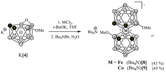 Unlike the 9-methylsulfide derivative [9-MeS-7,8-C2B9H11]−, the reaction of asymmetric K[4] with anhydrous FeCl2 unexpectedly gave a single isomer [8]− instead of mixture of rac- and meso-diastereomers (Scheme 5). The 11B NMR spectrum of [8]− contains signals at 109.5, 9.7, 7.5, 1.1, −21.8 and −40.7 ppm corresponding to boron atoms which are the most distant from the metal atom, and the wide high-field signals at −403.4, −431.7, and −461.1 ppm due to the boron atoms, which are directly connected to the metal with general relative integral ratio 2:2:2:2:2:2:2:2:2. Based on the comparison of this spectrum with the 11B NMR spectra of the methylsulfide derivatives rac-[4,7′-(MeS)2-3,3′-Fe(1,2-C2B9H10)2]− and meso-[4,4′-(MeS)2-3,3′-Fe(1,2-C2B9H10)2]− [54], we tentatively identified the compound obtained as the 4,7′-isomer rac-[4,7′-(MeO)2-3,3′-Fe(1,2-C2B9H10)2]−. In a similar way, the reaction of K[4] with anhydrous CoCl2 in tetrahydrofuran in the presence of potassium tert-butoxide gave diamagnetic rac-[4,7′-(MeO)2-3,3′-Co(1,2-C2B9H10)2]− as the single isomer (Scheme 5). The 11B NMR spectrum of [9]− contains singlets at 13.9 ppm and doublets at 5.2, −0.8, −7.9, −9.0, −19.8, and −24.6 ppm with an integral intensity ratio 2:2:2:4:2:4:2. The 1H NMR spectrum of [9]− contains the 1:1:1:1 quartet of the methoxy group at 3.23 ppm (3JB,H = 3.9 Hz), signals of the carborane CH groups at 3.81 and 3.70 ppm and broad signal of the BH groups in the range 2.6–0.5 ppm.