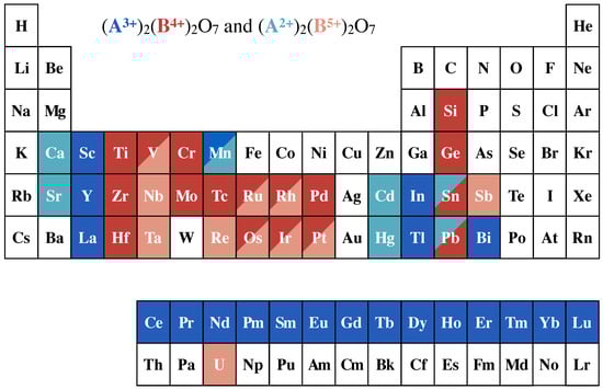 (color online) The periodic table with elements highlighted that can adopt the pyrochlore lattice. The colors indicate the elemental oxidation states, with 2+ in teal, 3+ in blue, 4+ in red, and 5+ in pink. Adapted from Ref. [4].