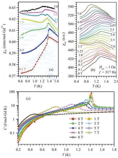 Li et al. [12] recently performed detailed studies on Gd2Ge2O7 (GGO). As shown in Figure 2, at zero or small applied magnetic fields (H), the dc magnetic susceptibility (), ac magnetic susceptibility , and specific heat of GGO consistently show an anomaly or peak at = 1.4 K, which represents a long-range magnetic ordering. For , an extra shoulder around 0.9 K is induced with H = 1 T, which then shifts to below 0.6 K with H = 1.5 T. Meanwhile, shows a more clear evolution of the field-induced anomalies: (i) at H = 1.5 T, a shoulder emerges around 0.9 K and then shifts to lower temperatures with increasing field; (ii) for H > 1.5 T, the anomaly at 1.4 K splits into two peaks. The lower one shifts to lower temperatures and disappears while field increases to 3 T; (iii) for H > 3 T, a new shoulder develops below 1.4 K and shifts to lower temperatures with increasing field; (iv) is consistently suppressed by increasing field, which is also observed from specific heat. A magnetic phase diagram was constructed based on the data, as shown in Figure 3. At least four different magnetic phases can be distinguished here, which is similar to that of Gd2Sn2O7 (GSO) [13,14].