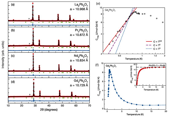 (color online) XRD patterns of (a) La2Pb2O7, (b) 2Pb2O7, (c) Nd2Pb2O7, and (d) Gd2Pb2O7. The refinements are to the cubic pyrochlore structure (green crosses below the refinements) with the lattice parameter indicated for each. The asterix (black) marks the (111) Bragg reflection, which is weak due to chemical disorder. (e) Low-temperature heat capacity of Gd2Pb2O7, showing a clear magnetic transition and a T dependence suggestive of ferromagnetic ordering, despite the negative Weiss constant (f) Heat capacity and integrated entropy of Gd2Pb2O7, indicating the release of the full S = 7/2 entropy with R ln(2S + 1) = R ln(8). From Ref. [22].