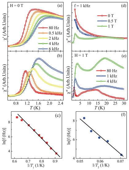 (color online)Temperature dependence of (a) the real part and (b) the imaginary part of the ac susceptibility for Ho2Ge2O7 below 3 K; (c) Arrhenius law fit of the low-temperature peak position in ; (d) high-temperature at f = 1 kHz with varying field strength; (e) high-temperature at H = 1.0 T with varying frequency; (f) Arrhenius law fit of the high-temperature peak position in . From Ref. [29].