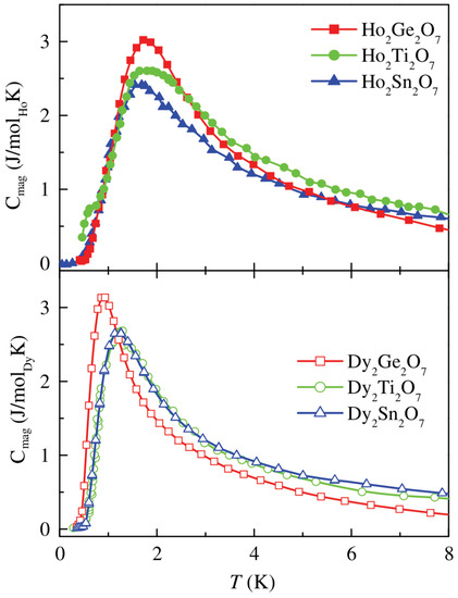 Zhou et al. studied the magnetic heat capacity (Cmag) of HGO (Figure 7a) [25]. The calculated zero-point entropy is near the characteristic spin ice zero-point entropy = R ln(3/2). The measured properties, including a small and positive Curie-Weiss constant, a magnetization saturating to half the magnetic moment, and a magnetic diffusing scattering with pinch point singularities, are all evidence confirming that HGO is a dipolar spin ice. Similar behaviors were also observed for Dy2Ge2O7 (DGO), which makes it another dipolar spin ice [25,26].