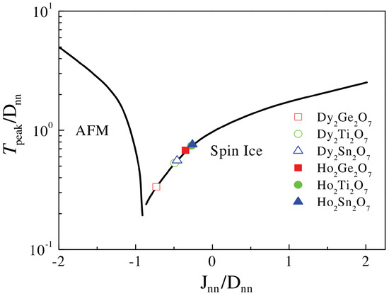 Zhou et al. [25] further studied the chemical pressure effects on studied spin ices by comparing their magnetic specific heat (Figure 8), including HSO, HTO, HGO, Dy2Sn2O7 (DSO), Dy2Ti2O7 (DTO), and DGO. According to the so-called “dipolar spin ice model” proposed by den Hertog and Gingras [27], the low-temperature magnetic properties of a pyrochlore spin ice are controlled by the magnetic exchange () and dipolar interaction () of the nearest-neighbor spins. The spin ice state is only stable with / > −0.91. For / < −0.91, the system undergoes a transition to a low-temperature Q = 0 antiferromagnetically ordered state. Moreover, the simulated specific heat using DSIM shows that its peak intensity and position is related to / ratio. With the experimental value of for specific heat and the calculated = 5/3() (where is the nearest-neighbor RE spin distance), the / values of all six spin ices were calculated and therefore located on the DSIM phase diagram. As shown in Figure 8, with increasing chemical pressure or decreasing lattice parameters, the Ge-spin ice approaches the phase boundary from the spin ice side. One noteworthy feature is that for DGO with smallest / = −0.73, its Cmag has the highest intensity, which is consistent with the sharp increase of Cpeak calculated from DSIM as the spin ice system approaches / < −0.5 [28]. The possibility to stabilize a larger fraction of magnetic monopole in DGO also has been discussed by Zhou et al. in Ref. [26].