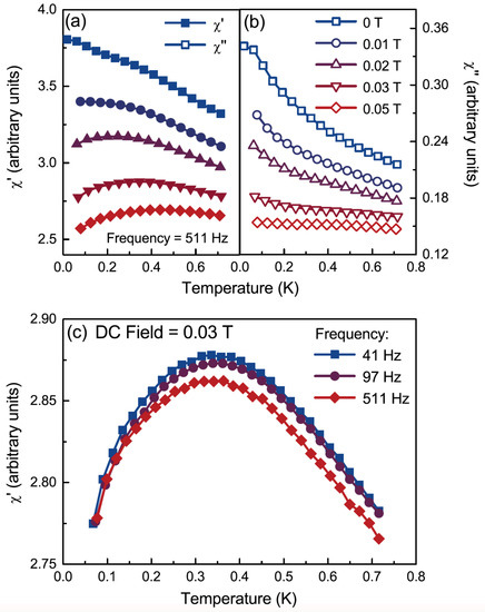 Hallas et al. studied the magnetic properties of Tb2Ge2O7 (TGO) [33]. A Curie-Weiss fit of the dc susceptibility leads a Weiss temperature = −19.2 K, representing net antiferromagnetic exchange interactions. The specific heat shows two anomalies around 5.5 K and 1.2 K. As shown in Figure 9, at zero dc field, both the and show no sign of magnetic ordering down to 20 mK. An applied field as small as 0.01 T induces a broad peak in . This peak is frequency independent (Figure 9c) but shifts to higher temperatures with increasing dc field. This field enhancement of this peak combined with its frequency independence suggest that the origin of this feature is ferromagnetic in character. Moreover, the increase of magnetic diffuse scattering intensity at low Q [33] also confirms the formation of ferromagnetic domains at low temperatures.