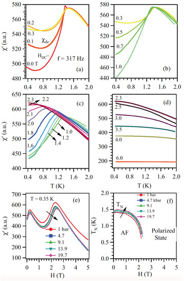 As shown in Figure 10, Li et al. studied the ac susceptibility of Er2Ge2O7 (EGO). At zero dc field and ambient pressure, shows a maximum at = 1.4 K, which is consistent with the peak position, or magnetic ordering, observed from the dc susceptibility and specific heat data [42]. With increasing dc field, exhibits complicated behaviors: for H ≤ 0.2 T, remains constant and is enhanced below ; (ii) for 0.3 ≤ H ≤ 1.0 T, decreases slightly and the low-temperature upturn of is suppressed; (iii) for 1.0 ≤ H ≤ 2.3 T, the cusp-like anomaly of becomes a broad peak, which shifts to lower temperatures with increasing fields; (iv) for 2.3 < H ≤ 6.0 T, the feature of is smeared out. The field dependence of measured at 0.35 K (Figure 10e) again reflects this evolution. The (H) data shows a double peak feature with the second peak at a critical field Hc = 2.3 T. The data obtained under applied pressure also shows that both and Hc are enhanced with increasing pressure (Figure 10f).