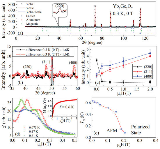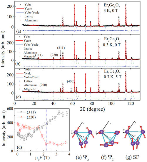 Dun et al. measured the neutron powder diffraction of EGO under applied magnetic fields [43]. As shown in Figure 11, several magnetic Bragg peaks, such as (111), (220), and (311), are clearly observed at 0.3 K (< = 1.4 K). Moreover, the field dependence of the (220) and (311) Bragg peaks intensities shows complicated evolution: (i) with H < 0.15 T, a magnetic domain alignment results in a quick drop of the (220) peak intensity with increasing field; (ii) between 0.15 and 2 T, the spins gradually rotate with the magnetic field but keep the AFM nature; (iii) around a critical field Hc = 2 T, the (220) Bragg peak intensity abruptly drops to a background value, while the (311) Bragg peak intensity continuously increases. This demonstrates that above Hc, EGO enters a spin polarized state. The observed FM(400) and AFM (200) Bragg peaks on the pattern measured at H = 5 T (Figure 11c) suggest that this polarized state is similar to the splayed ferromagnetic (SF) state in the manifold. This domain alignment around 0.15 T and the critical field around 2 T are consistent with the critical fields observed from ac susceptibility. The refinement of the 0.3 K data under zero field makes no difference between the and spin structure in the manifold. Meanwhile, the studies on Er2Ti2O7 (ETO) [44,45] have shown that the applied field along the [1 −1 0] direction will select the two domains with lower intensity if the phase is presented and lead to a drop of the (220) magnetic peak intensity with increasing field. Therefore, the drop of (220) peak intensity with applied field of EGO suggests a ground state since the similar selection rule should also work in powder sample with additional averaging effect.