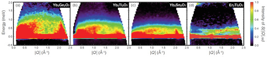 - Hallas, A.M.; Gaudet, J.; Butch, N.P.; Tachibana, M.; Freitas, R.S.; Luke, G.M.; Wiebe, C.R.; Gaulin, B.D. Universal Dynamic Magnetism in Yb-Pyrochlores with Disparate Ground States. Phys. Rev. B 2016, 93, 100403. [Google Scholar] [CrossRef]