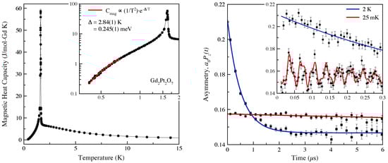 (color online) Heat capacity (left) and muon spin relaxation measurements (right) on Gd2Pt2O7, showing clear evidence for long-range magnetic ordering. From Ref. [59].