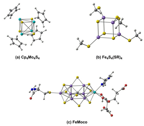 Our interest in the electronic structure of these cubane clusters lies in the extent to which they are stabilized by metal–metal bonding. Stable, coordinatively saturated cubane clusters are known across much of the transition series (see Figure 1 for selected examples), and many have important roles in biology. Fe4S4 clusters, for example, are ubiquitous in biological electron transfer [21] and were amongst the first to be studied using the broken-symmetry approach pioneered by Noodleman [22]. More recently, the remarkable structure of the Fe7Mo double cubane in the FeMo cofactor in nitrogenase has been revealed [23,24], as has the importance of Mn3Ca cubane motifs in water oxidation [25]. The presence of multiple bridging ligands between the metals in all these clusters means that whilst metal–metal bonding is possible, it is not absolutely essential for stability, and as a result, the bonding in cubanes spans the entire spectrum from strong covalent to weak exchange coupling. The cyclopentadienyl-capped clusters Cp4M4E4 (M = Cr, Mo; E = O, S) [26] are a case in point wherein delocalized covalent bonding in the molybdenum systems gives way to weak exchange coupling in the chromium analogues.
