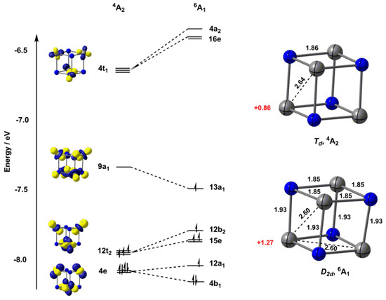 For [V4N4]+, we identified two closely-spaced states, both of which are based on a tetrahedral architecture (Figure 2). The first of these is a 4A2 state with rigorous Td symmetry: the six V–V bond lengths are identical at 2.65 Å (using the TPSS functional [29]). In the alternative sextet state, 6A1, the tetrahedron is slightly elongated along one of the two-fold axes, giving four long (1.93 Å) and eight short (1.85 Å) V–N bonds and overall D2d symmetry. The average V–V bond lengths in the 6A1 state are somewhat smaller than those in 4A2 (2.60 Å vs. 2.65 Å), while the average V–N bond lengths are marginally longer (1.88 Å vs. 1.86 Å). The origin of these structural patterns is apparent in the Kohn–Sham orbital diagram, also shown in Figure 2. In the perfect tetrahedron, the V orbitals form a basis for a1 and t2 representations (the z axis is defined locally here as the vector passing through each V atom and the centre of mass of the cluster). The a1 combination is bonding with respect to the V–V interactions but also strongly V–N antibonding, and as a result, it lies above the weakly V–V bonding t2 set. The orbitals, in contrast, are aligned tangentially around the surface of the tetrahedron, and form a basis for e + t1 + t2 representations, the doubly degenerate e orbital being strongly V–V bonding. In the 4A2 state, the two components of the 4e orbital are doubly occupied, while the three components of 12t2 each contain a single electron, giving rise to a perfectly symmetric structure with six equivalent V–V bond lengths of 2.65 Å. Promotion of a single electron from the 4e orbital into 9a1 results in an orbitally degenerate 6E state, and hence to a first-order Jahn–Teller instability that drives the distortion to D2d symmetry (and thus to the 6A1 state). The population of the 9a1 orbital also strengthens the V–V bonds while at the same time weakening the V–N bonds, leading to a global contraction of the V4 tetrahedron.