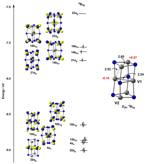 Turning now to the larger [V6N6]+ cluster, we considered a range of structures that have been proposed in the literature for related species, including the columnar fragment of the rock-salt structure proposed by Hirabayashi and Ichihashi (D2h symmetry) and also a hexagonal prismatic structure with two staggered V3N3 hexagons (D3d symmetry), which has been identified as the global minimum for the Al6N6 cluster [41]. In the case of [V6N6]+, this hexagonal structure proved to be over 3 eV higher in energy than the D2h alternative for all functionals, and was not considered further. As was the case for the [V4N4]+ cluster, we found a quartet ground state (4B3g) with overall D2h symmetry, with all alternative spin states substantially higher in energy. The V–V bond in the central layer of the cluster (V1–V1) is strikingly short at 2.23 Å (Table 2), a value that is indicative of strong multiple bonding. The bonds between the central and upper/lower layers (V1–V2) were somewhat longer, at 2.52 Å, whilst those within the top and bottom layers (V2–V2) are longer still, at 2.60 Å. All V–V contacts are, however, shorter than those found in either the 4A2 or 6A1 states of [V4N4]+. The Kohn–Sham orbitals for the 4B3g state, shown in Figure 4, confirm that, of the eleven available V 3d valence electrons, eight are paired in orbitals with significant V–V bonding character. Amongst the doubly occupied set, the 20ag and 15b3u orbitals are localized in the central V2N2 plane, and have strong V–V σ and V–V π character, respectively, consistent with the presence of a V=V double bond. The 4au and 10b1g orbitals, in contrast, are bonding with respect to all eight V1–V2 contacts between the central plane and the upper/lower layers of the column, accounting for the relatively short distances of 2.51 Å. The remaining three valence electrons occupy the 21ag, 14b2u and 16b3u orbitals, none of which are strongly V–V bonding or antibonding. There are, therefore, many qualitative parallels between the 4A2 state of [V4N4]+ and the 4B3g state of [V6N6]+: in both cases, some of the available electrons are paired up to form V–V covalent bonds, while the remainder are distributed singly over approximately non-bonding orbitals. The proportion of electrons in the two sets of orbitals changes as a function of the cluster size: for the 4A2 state of [V4N4]+, four of the seven available electrons are involved in V–V bonding, while in the 4B3g state of [V6N6]+ this fraction rises to 8/11, and the resulting increase in net bond order is behind the generally shorter bond lengths in the larger cluster.