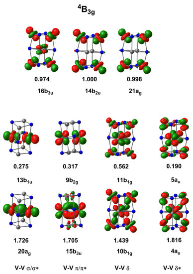 The CASSCF wavefunction for the 4B3g state of [V6N6]+ shown in Figure 5 revealed a qualitatively similar story about the V–V bonding, relative to the one established for [V4N4]+. We used a CAS(11,11) active space in which all four doubly occupied bonding orbitals in the Kohn–Sham scheme find antibonding counterparts in the virtual manifold that allow for strong correlations. These are most striking for the V–V σ and π bonds in the central V2N2 plane (occupations of the bonding–antibonding pairs are 1.726/0.275 (σ/σ*, 20ag/13b1u) and 1.705/0.317 (π/π*, 15b3u/9b2g)). Natural orbital occupations that differ dramatically from 2.0 and 0.0 are typical in clusters with multiple metal–metal bonds [42], and are highly indicative of weak bonding. The electrons in the 4au and 10b1g orbitals that mediate the bonding between the layers are also strongly correlated (1.439/0.562 and 1.816/0.190 for the 10b1g/11b1g and 4au/5au pairs, respectively). The three remaining singly occupied orbitals are then 21ag, 14b2u and 16b3u, all of which have occupations almost equal to 1.0. These three singly occupied orbitals bear a striking resemblance to the three singly occupied components of the t2 orbital in the 4A2 state of [V4N4]+.