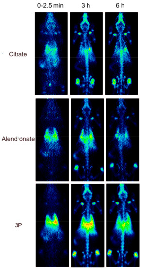 Nuclear imaging, and in particular PET, is routinely employed in the clinics to study the whole-body distribution of radiolabeled species with high sensitivity [24]. 18F-labelling of UCNPs has demonstrated to be an effective strategy to monitor the biodistribution of these nanomaterials in vivo [25,26,27], often in combination with other imaging modalities [28]. In this study, the observation of the UCNPs in vivo adhesion to the bones using MRI was discarded due to the intrinsic low sensitivity of the technique added to the specific characteristics of the bones: low water content, very short T2 relaxation times due to its rigid nature and susceptibility effects. Adopting the procedure reported by Li and coworkers [25], we radiolabelled phosphonate UCNPs by exposing the nanoparticles to [18F]F− ions with the aim of visualizing via PET their biodistribution in healthy rodents and gain information about their eventual accumulation in bones. As previously described [25], this straightforward synthetic method afforded high incorporation ratios, with non-decay corrected radiochemical yields of 36%, 43% and 43% for citrate, 3P and alendronate-UCNPs, respectively, resulting in estimated specific activity values of 105 MBq/mg for citrate-UCNPs and of 126 MBq/mg for 3P and alendronate-UCNPs. Only etidronate functionalised UCNPs resulted in low radiochemical yields (<10%), and therefore were no further investigated in vivo. Nanoparticles decorated with citrate were used as control since this carboxylate ligand did not show any specific affinity to HA (as confirmed by MRI, data not shown). The stability (Figure S13) and radiochemical purity of alendronate, 3P and citrate UCNPs were confirmed by radio-TLC at different time points. The radiochemical purity of the labelled particles was >95% at t = 5 h of incubation in physiologic saline solution (see Figure S14 for representative example).