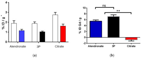 (a) 18F detection in bones in vivo (color) and ex vivo (white), where in vivo units are % ID/mL (where ID is the injected dose), and corresponds to all skeleton, while ex vivo is only femur; (b) Gd detection in femur bones by ICP-MS. ICP-MS data is presented as mean ± SEM of two independent measurements. * = statistically significant difference (p < 0.05); ** = statistically significant difference (p < 0.01), ns = non-significant by one-way ANOVA followed by Tukey’s test.