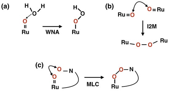 - Shaffer, D.W.; Xie, Y.; Concepcion, J.J. O–O bond formation in ruthenium-catalyzed water oxidation: Single-site nucleophilic attack vs. O–O radical coupling. Chem. Soc. Rev. 2017, 46, 6170–6193. [Google Scholar] [CrossRef]