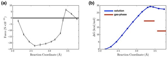 (a) Constrained force profile for the catalyst activation pathway for complex A. The statistical errors are calculated with a 95% confidence interval, and (b) the corresponding free energy profile in solution along with our estimates obtained from gas-phase calculations
