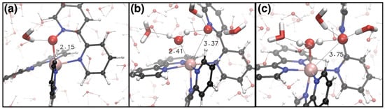 Representative snapshots of the initial, transition and product states during the catalyst activation pathway are shown in Figure 3. For clarity, the solvent molecules involved in hydrogen bonding interactions are highlighted. Initially, the ligand NO moiety forms one hydrogen bond on average with the solvent water molecules, as shown in Figure 3a. Close to the transition state corresponding to Q = 3.37 Å, a solvent water molecule (HO) approaches the metal center and binds to the Ru metal center in the process, as shown in Figure 3b. This provides an indication that as soon as the metal–NO bond is weakened, there is spontaneous adsorption of the water molecule on the (vacant) metal site. This also results in the metal–NO moiety forming upto three hydrogen bonds with the (solvent) water molecules (Figure 3b). At the product state (Q = 3.75 Å), the water molecule is strongly adsorbed on the metal center, and the ligand NO moiety is completely detached from the metal center, again forming upto three hydrogen bonds with the aqueous solvent, as shown in Figure 3c.
