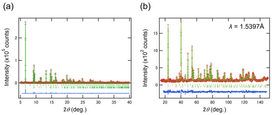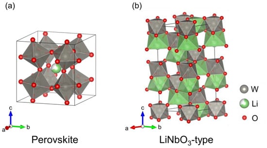 This study targeted lithium tungsten bronze, LixWO3, which is known to exist in the compositional range of x ≤ 0.5 and has the perovskite (Im−3) structure, as shown in Figure 1a [8]. This phase has typically been prepared by a conventional high-temperature solid state reaction [9,10] and electrochemical reaction [11,12]. We report that the use of high pressure stabilizes the LiNbO3-type structure (Figure 1b), for the first time in the tungsten bronze family. In addition, LixWO3 is A-site non-stoichiometric (0.5 ≤ x ≤ 1) with the variable d electron count of 0.5~1. We show the structural characterizations by means of X-ray diffraction (XRD) and neutron diffraction (ND), along with physical properties by electrical resistivity measurement.