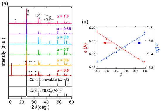 (a) XRD patterns of LixWO3 (0.5 ≤ x ≤ 1.0) synthesized at 5–8 GPa, demonstrating the formation of the rhombohedral structure. Calculated patterns for the perovskite (Im−3) and LiNbO3 (R3c) structures are shown for comparison. Asterisks denote unreacted starting materials of Li2WO4, WO2, and WO3. (b) Lattice parameters, a (red) and c (blue), of the rhombohedral LixWO3 phase as a function of x. The errors are within the size of the symbols. The solid lines are linear fits to the data.
