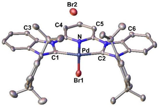 The products 3sa, 3benz, and 5sa could be obtained analytically pure after extraction with dichloromethane and subsequent precipitation using diethyl ether (3sa, 3benz) or washing with diethyl ether (5sa) in quantitative (3sa), 85% (3benz), and 98% (5sa) yields (Scheme 5). Surprisingly, 3benz hydrolyzed slowly in wet solvents, whereas 3sa was perfectly stable also in the presence of a large excess of water. The identity of the palladium complex 3benz was therefore confirmed by a solid-state structure (Figure 2). The structural parameters of the complex were found to be well in line with those in previous reports on related conventional NHC complexes [41]. All three aromatic rings of the pyridine and benzannulated heterocycle are positioned in one plane with a distance between C3 and C4 (C5, C6, respectively) of 3.352 Å (3.329 Å, respectively). Thus, steric stress of the hydrogen atoms bound to C3, C4, C5, and C6 might be responsible for the sensitivity of 3benz to water, which was not found for 3sa.