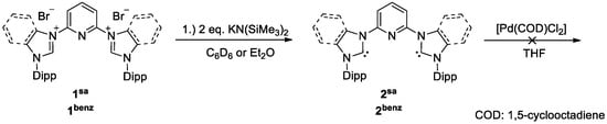 Deprotonation of the carbene precursors with KN(SiMe3)2 led to the clean formation of the free carbenes, as evidenced by 1H NMR spectroscopic analysis (Supplementary Materials). The carbenes were stable over the course of days in tetrahydrofuran (THF) or benzene solutions. Unfortunately, we repeatedly obtained a mixture of compounds when treating the solutions of the free carbene 1sa with metal precursors such as dichloro(1,5-cyclooctadiene)palladium(II) [Pd(COD)Cl2] (Scheme 2; cf. vide infra, Table 1). In fact, reaction control by 1H NMR suggested a crude yield of only 18% of the desired, chelated palladium complex for the reaction in THF. When running the reaction in benzene, we observed the formation of the palladium complex with 40% yield.