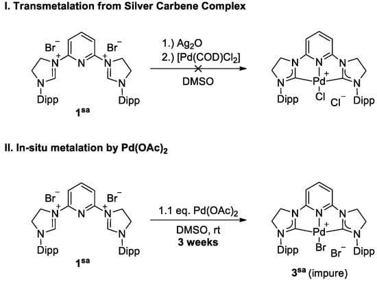 Following our computational predictions [36,37], we decided to synthesize 2,6-pyridine diNHC (CNC) complexes with bulky 2,6-diisopropylphenyl substituents. As NHCs with moderate to fairly strong π-accepting properties, we chose the saNHC (1sa) and the benzNHC (1benz) scaffolds. Both ligand precursors were conveniently synthesized by the reaction of 2,6-bromopyridine with 1-(2,6-diisopropylphenyl)-2-imidazoline (benzimidazole, respectively) following a modification of the previously reported procedure (Scheme 1) [52].