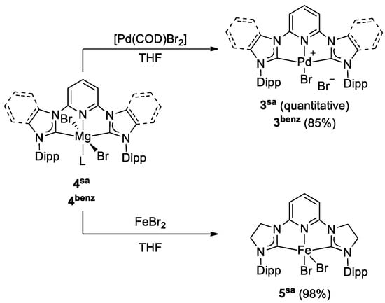 To our delight, 4sa and 4benz evolved to be excellent transmetalating reagents. Treatment of a solution of 4sa and 4benz in THF with either [Pd(COD)Br2] or FeBr2 led to the rapid formation of suspensions due to the formation of the desired transition metal complexes. Preliminary investigations with nickel(II) bromide, cobalt(II) bromide, bismuth(III) chloride, and lead(II) bromide indicated that the transmetallation is also feasible with these metal precursors.