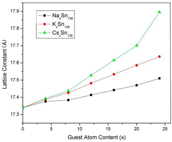 - Xue, D.; Myles, C.W.; Higgins, C. Effect of Guest Atom Composition on the Structural and Vibrational Properties of the Type II Clthrate-Based Materials AxSi136, AxGe136 and AxSn136 (A = Na, K, Rb, Cs; 0 ≤ x ≤ 24). Materials 2016, 9, 691. [Google Scholar] [CrossRef] [PubMed]