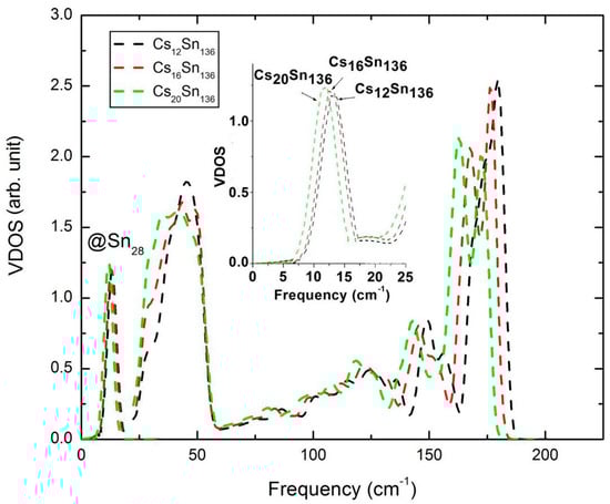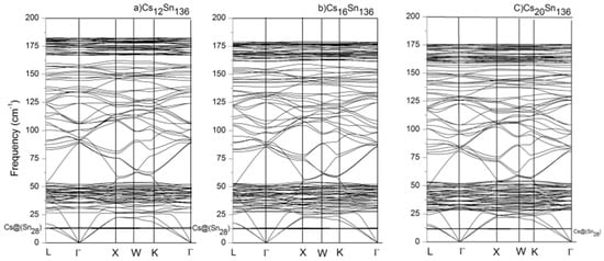 2.1. Structural Property of AxSn136 (0 ≤ x ≤ 24; A = Na, K, Cs) and Vibrational Property of CsxSn136 (x = 12, 16, 20)