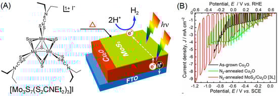 - Shinde, P.S.; Fontenot, P.R.; Donahue, J.P.; Waters, J.L.; Kung, P.; McNamara, L.E.; Hammer, N.I.; Gupta, A.; Pan, S. Synthesis of MoS2 from [Mo3S7(S2CNEt2)3]I for Enhancing Photoelectrochemical Performance and Stability of Cu2O Photocathode toward Efficient Solar Water Splitting. J. Mater. Chem. A 2018, 6, 9569–9582. [Google Scholar] [CrossRef]