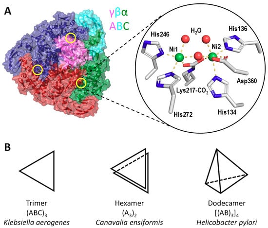 - Balasubramanian, A.; Ponnuraj, K. Crystal Structure of the First Plant Urease from Jack Bean: 83 Years of Journey from Its First Crystal to Molecular Structure. J. Mol. Biol. 2010, 400, 274–283. [Google Scholar] [CrossRef]