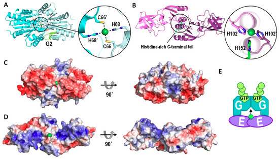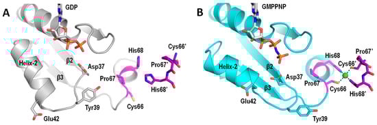Structural insights into how Ni2+ and GTP induce dimerization of UreG were provided by the crystal structure of the UreG dimer in complex with Ni2+ and GMPPNP, a nonhydrolyzable analogue of GTP [51]. The GTP binding pocket is sandwiched between two UreG chains and a Ni2+ ion is coordinated by the conserved CPH motif from each chain [51]. The structure of Ni/GMPPNP-bound UreG dimer is compared to that of the GDP-bound UreG in the UreGFD complex (Figure 4). Upon GTP binding, the γ-phosphate of GTP introduces a charge–charge repulsion on Asp37 in the G2 switch, initiating a swinging motion of helix-2, and Glu42 forms a hydrogen bond with Arg130 of the opposite chain. Consequently, the zip-up motion of β2 and β3 propagates the conformational changes to the CPH motif, where Cys66 and His68 reorientate towards the dimeric interface to chelate a Ni2+ ion in a square-planar geometry (Figure 4B) [51]. The structural changes observed also explain why UreG dissociates from the UreGFD complex upon GTP binding as residue Tyr39 in the G2 region swings outward and makes steric clashes with UreF [48].